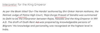As per the Hardoi Gazetteer on Page 71, ' Kunwar Durga Parshad, taluqdar of Sarawan-Baragaon is a great scholar and has written several Persian works on history and morals, but few follow his examples.'